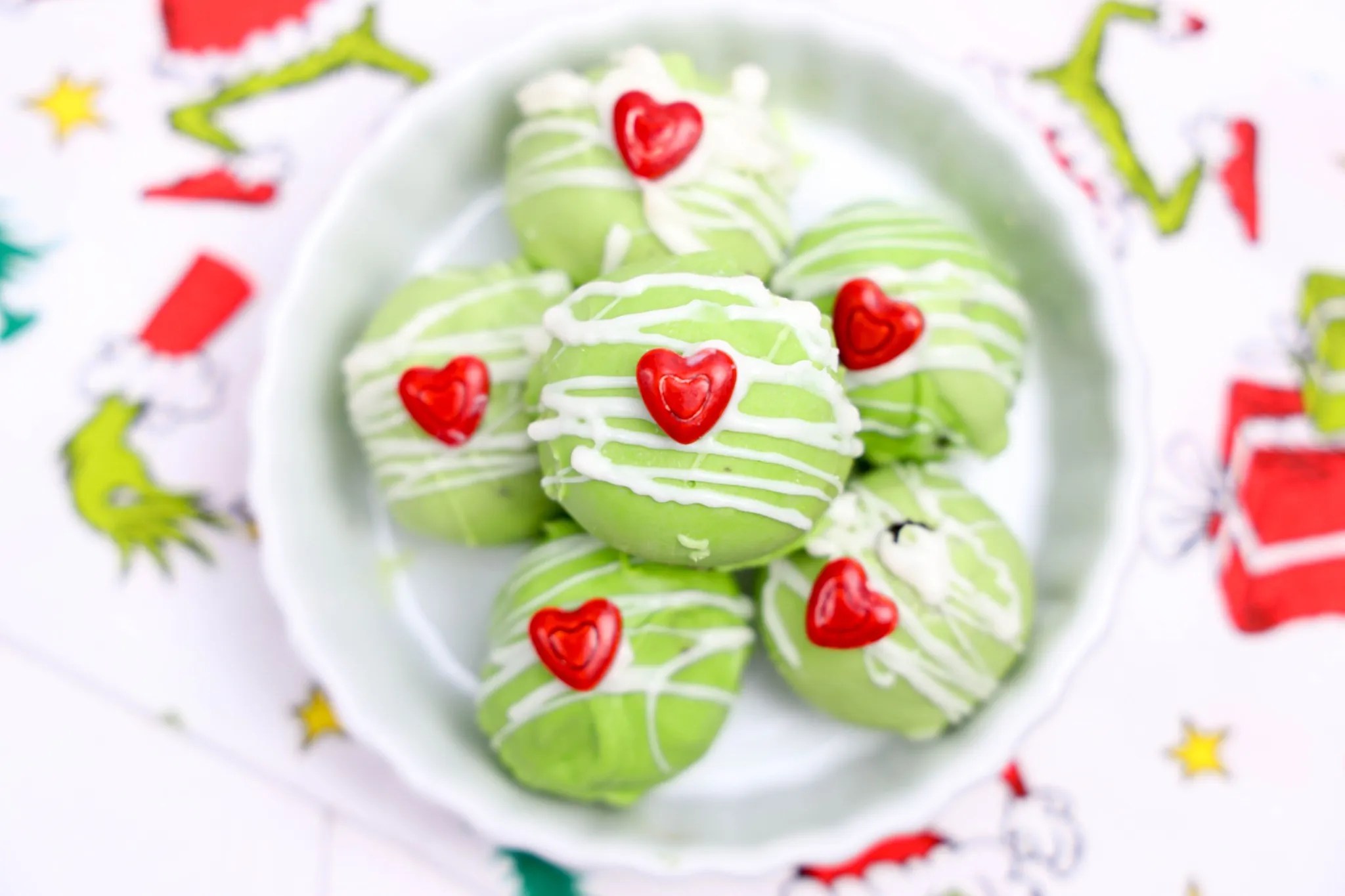 With just a handful of ingredients, you get a creamy, chocolatey truffle center dipped in bright Grinch-green candy coating and topped with a sweet red heart. They’re whimsical, fun, and so easy to make.