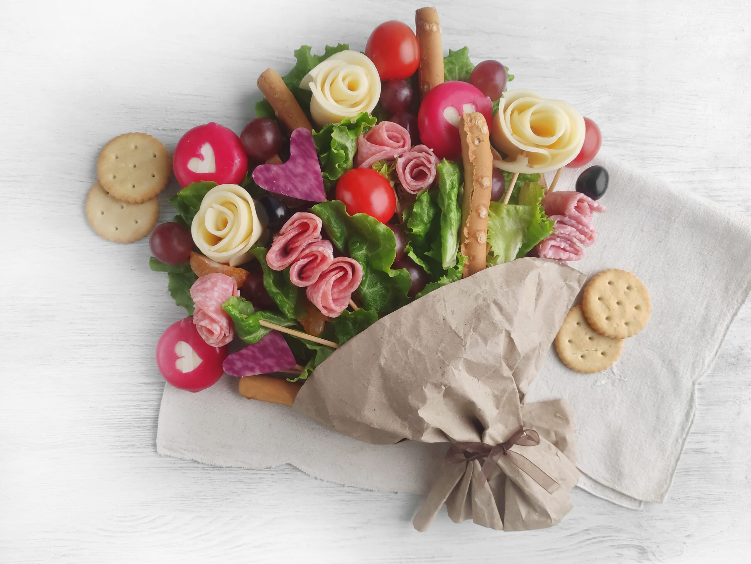 Regarding crackers, breadsticks and crackers in stick form work best in the bouquet. These shapes stand up better than those in more traditional shapes. We formed flowers out of salami, but you can replace some or all of that with prosciutto or pepperoni.