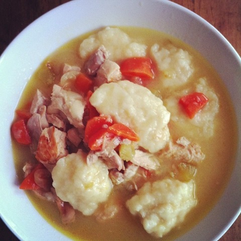 I’ve been sick a lot lately and craving soup. Stuck in bed, when I’ve felt up to it, I’ve also been reading a lot and recently, a soup from Diane Mott Davidson’s book The Main Corpse jumped out and caught my attention. I changed it slightly – left out the mushrooms (I’m allergic), increased some of the quantities, and substituted homemade dumplings (from my grandmother’s recipe that I’ve tweaked a bit) for the noodles. It was outstanding (and I’m not generally much of a soup person). You could certainly add other veggies to it if desired and you could eliminate or decrease the wine. She used only 2 T. and i increased that to add a bit of a coq au vin quality to it. If leaving out the wine entirely, I’d suggest adding in some other acid in its place – perhaps a bit of lemon juice (and then some lemon pepper to round out the flavour) or maybe just a dash of vinegar.
